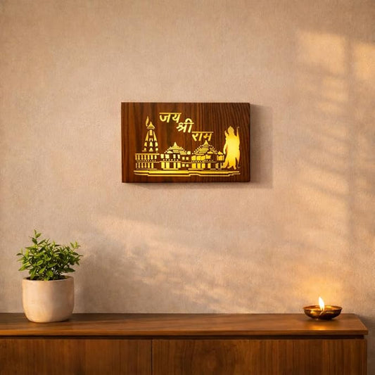Jai Shri Ram Ayodhya Mandir Wooden Wall DΓ©cor - Spiritual LED Style Temple Art